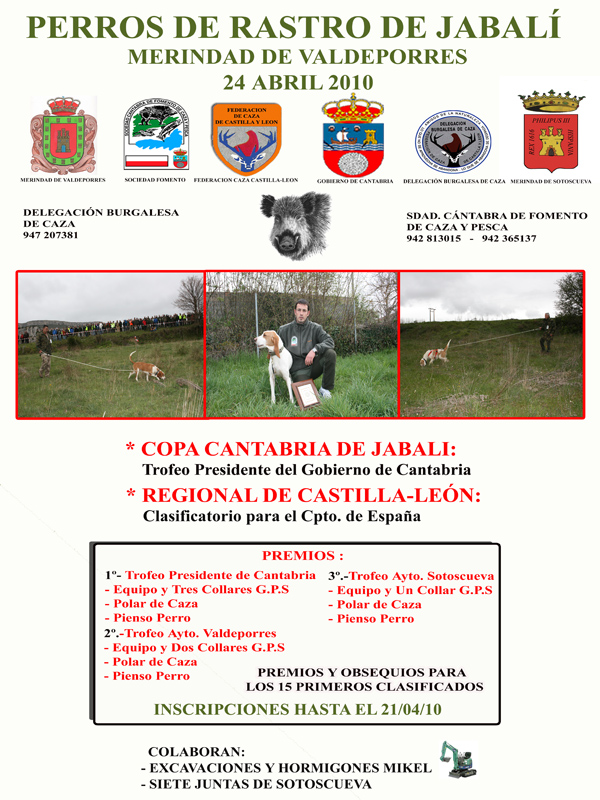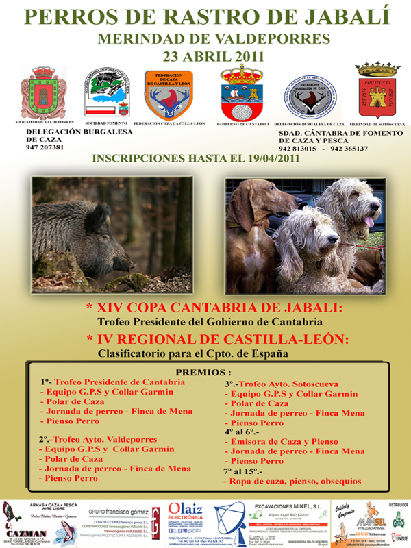 Bajo la organización de la Sociedad Cántabra de Fomento de Caza y Pesca, se celebró este sábado 23 de abril la XIV Copa Cantabria de Perros de Rastro de Jabalí “Trofeo Presidente del Gobierno de Cantabria”. La prueba se celebró en Pedrosa de Valdeporres, donde paralelamente la Federación de Caza de Castilla y León celebraba el IV Campeonato Regional de Castilla y León, siendo seguida por bastante público que disfrutó del trabajo de perros y monteros y de una excelente organización, que cuidó al máximo todos los detalles.