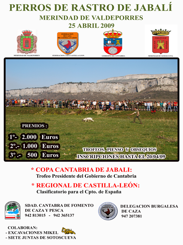 Bajo la organización de la Sociedad Cántabra de Fomento de Caza y Pesca, se celebró el pasado sábado día 25 de abril la XII Copa Cantabria de Perros de Rastro de Jabalí “Trofeo Presidente del Gobierno de Cantabria”. La prueba se celebró en Pedrosa de Valdeporres, donde paralelamente la Federación de Caza de Castilla y León celebraba el II Campeonato Regional de Castilla y León, siendo seguida por bastante público que disfrutó del excepcional trabajo de perros y monteros y de una excelente organización, que cuidó al máximo todos los detalles.