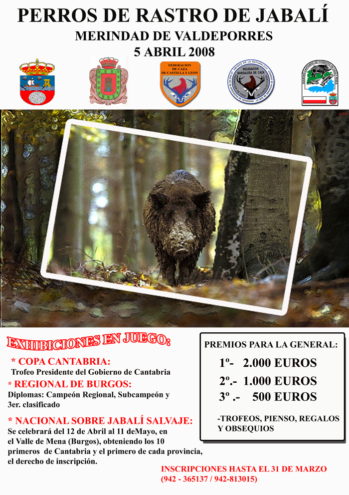 Cerca de un centenar de perros se dieron cita el pasado sábado 5 de abril en la Copa Cantabria de Rastro de Jabalí que anualmente celebra la Sociedad Cántabra de Fomento de Caza y Pesca. Un magnífico día amanecía en Santelices, lugar que a las 8,30 horas de la mañana servía de punto de encuentro de los participantes. Excelente ambiente montero ante lo que se “jugaban” los participantes: por una parte unos premios en metálico más que apetecibles, así como el campeonato de la especialidad de Castilla-León y la posibilidad de participar en el II Campeonato de España de Rastro de Jabalí en la modalidad de perro suelto en Mena, el cual comienza este fin de semana (12/04/08).